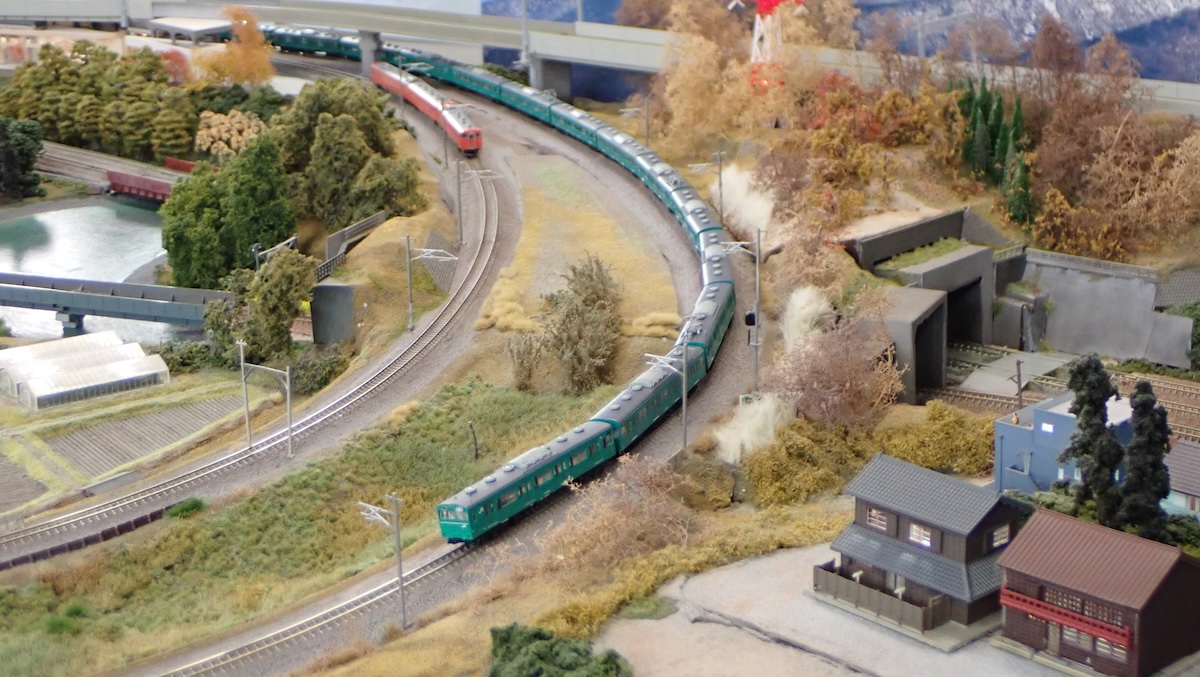 まずは103系を走らせます。15両もの長編成が、レイアウトの大カーブを走り抜ける様は圧巻です。